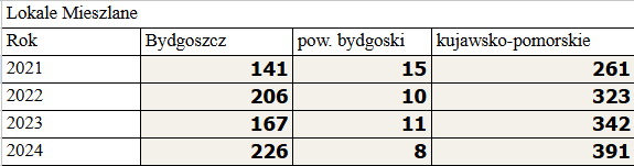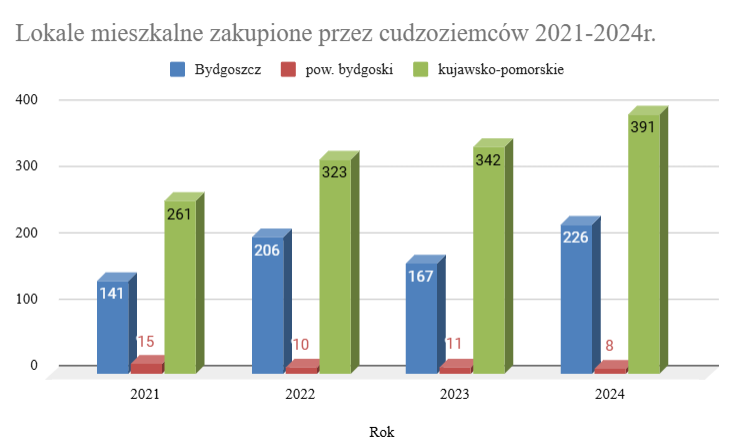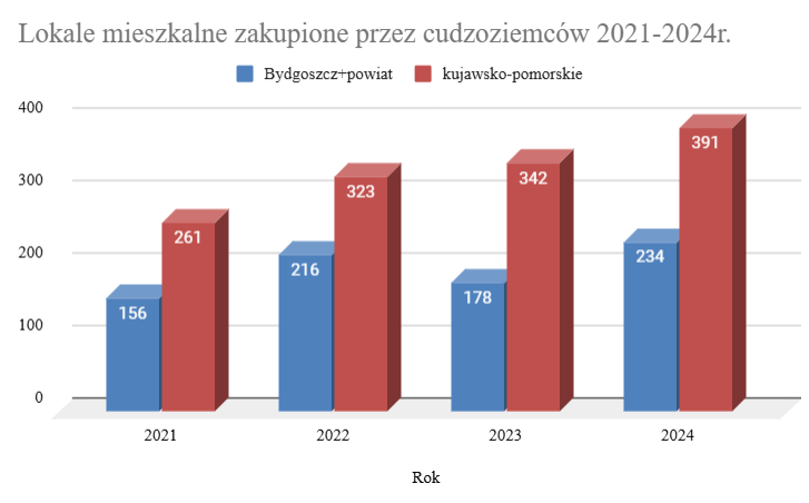 Aby lepiej zobrazować skalę zjawiska, poniżej przedstawiamy zestawienie liczby lokali mieszkalnych nabytych przez cudzoziemców w Bydgoszczy, powiecie bydgoskim oraz w całym województwie kujawsko-pomorskim w latach 2021–2024.