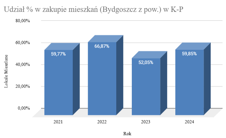 Udział Bydgoszczy i powiatu bydgoskiego w całkowitej liczbie mieszkań kupowanych przez cudzoziemców w województwie kujawsko-pomorskim utrzymuje się na bardzo wysokim poziomie, choć nie jest on stały.