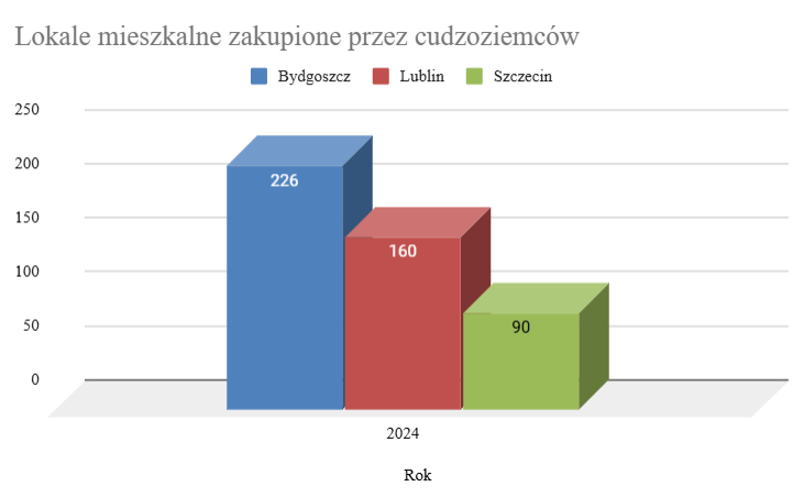 Różnica między Bydgoszczą a pozostałymi ośrodkami jest znacząca – liczba mieszkań kupionych przez obcokrajowców w Bydgoszczy była o około 40% wyższa niż w Lublinie i ponad dwukrotnie wyższa niż w Szczecinie.