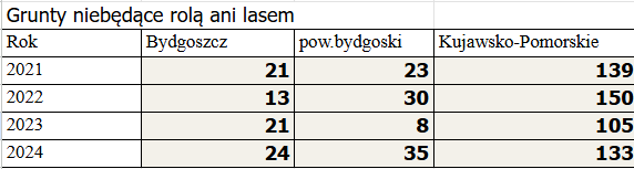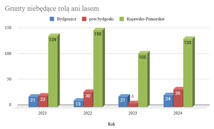 W latach 2021–2024 liczba transakcji związanych z gruntami niebędącymi ani rolą, ani lasem w województwie kujawsko-pomorskim zmieniała się dość wyraźnie. W 2021 roku odnotowano ich 139, rok później 150, w 2023 nastąpił spadek do 105, a w 2024 ponownie wzrost – do 133.